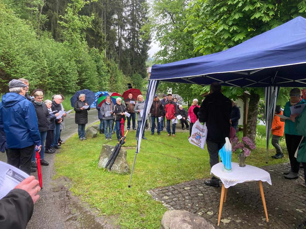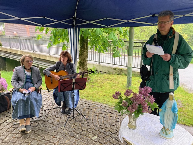 Zur Maiandacht hatte die Gemeinschaft im Unteren Dorf Mitglieder und Freunde eingeladen. Am Namenstag des Hl. Nepomuk trafen sich auch heuer wieder viele Gleichgesinnte an der Statue an der Brücke über den Weißen Regen. Pfarrer Johann Wutz gedachte anfangs des Brückenheiligen und zelebrierte dann eine Maiandacht, die unter dem Motto „Maria, Königin des Friedens“ stand. Zwei Lektoren aus den Reihen der GUD unterstützen ihn mit Texten zu diesem sehr aktuellen Thema. Musikalisch trugen die Stoiber-Deandln mit wunderbaren Liedern zum besonderen Maiandacht-Ambiente in der freien Natur mit dem leisen Rauschen des nahen Weißen Regens bei. Kurz vor Beginn setzte auch der Dauerregen aus und so konnten die vielen Besucher ihren Regenschirm zusammengefaltet lassen. Die anschließende Feier in den Mai wurde aber trotzdem in der warmen und trockenen Garage von Josef und Olga Pritzl abgehalten. Die nächsten Veranstaltungen der GUD sind der Flohmarkt am 8. Juni in der Bahnhofstraße und der Vereinsausflug nach Rothenburg ob der Tauber am 18. Juni.