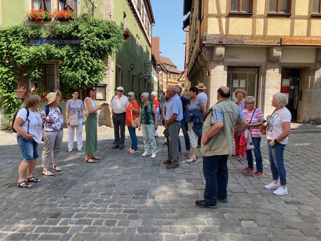 Der jährliche Tagesausflug der GUD führte Mitglieder und Freunde nach Rothenburg ob der Tauber. Die Geschichte des mittelalterlichen Fachwerkstädtchens reicht bis ins Jahr 970 nach Christus zurück. Es wurde um 1140 von Konrad dem Dritten, dem ersten Stauferkönig erworben und ausgebaut. Der Stadtname weist auf eine Burg hin, die auf einer Rodung oberhalb des Flüsschens Tauber erbaut wurde und den Grundstein für die spätere Stadt darstellte. Mit ca. 11.300 Einwohnern gehört sie zu den eher kleineren Städten in Bayern. Sie liegt in Franken, ca. 80 km westlich von Nürnberg, an der bayerischen Landesgrenze zu Baden Württemberg.