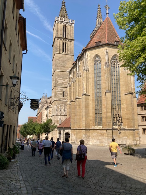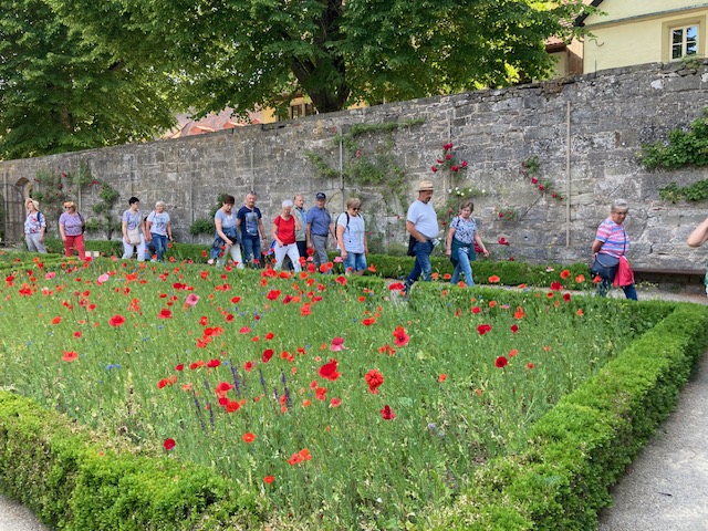 Nach einer sehr informativen Stadtführung, die zu den wichtigsten Orten und Plätzen führte, erreichte die zwei inzwischen geteilten Gruppen wieder den Ausgangsort am Hotel Rappen, nahe an der Stadtmauer gelegen, wo man im schattigen Biergarten auch das Mittagessen einnahm. Schon gleich nach der Ankunft, hatte man von hier einen ersten Spaziergang auf und entlang der Stadtmauer unternommen. Hier erfuhr man auch, dass Rothenburg und seine 3,6 Kilometer lange Stadtmauer im 2. Weltkrieg zu 45 Prozent zerstört wurde und mit viel Engagement und vielen Spenden wieder originalgetreu aufgebaut wurde. Eingelassene Spendensteine im Wehrgang der Stadtmauer geben die Namen der Spender und die Meterzahl des gespendeten Wiederaufbaus bekannt.