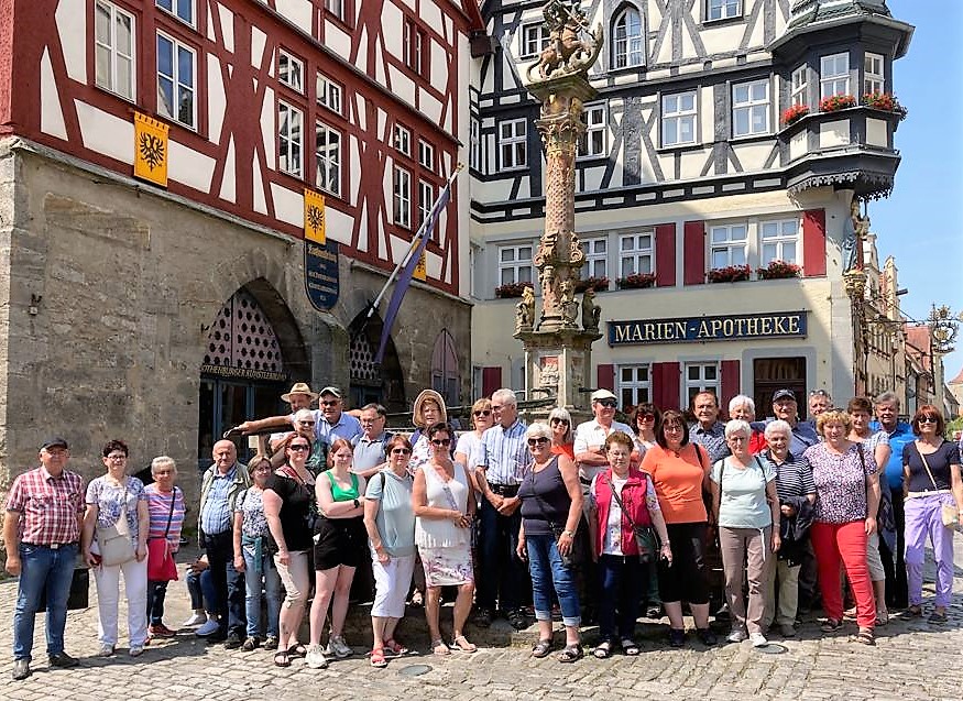 Nach dem Mittagessen war ausreichend Gelegenheit, die Stadt auf eigene Faust zu erkunden, einen kleinen Einkaufsbummel in den vielen Geschäften zu machen, der Stadtkapelle zuzuhören, die auf dem Marktplatz ihr 40-jähriges Bestehen feierte und hier auch die Szene vom Meistertrunk des Bürgermeisters, in zwei sich öffnenden Fenstern des Rathauses mitzuverfolgen, der die Stadt vor der Zerstörung durch den Feldherrn von Tilly bewahrte. Ein Muss war schließlich auch der immerwährende Weihnachtsmarkt von Käthe Wohlfahrt. Eine Erfrischung im Schatten der Stadtmauern oder der großen Kastanien im Biergarten machte an diesem warmen Sommertag schließlich wieder fit für die Heimfahrt. Hier durfte auch heuer wieder die obligatorische „Drei-Gänge-Brotzeit“ mit Nachspeise nicht fehlen. Eine Verlosung, die bei jedem Ausflug der GUD fester Bestandteil ist, schloss schließlich eine sehr gelungene Ausflugsfahrt mit vielen neuen Eindrücken in harmonischer Gesellschaft ab.