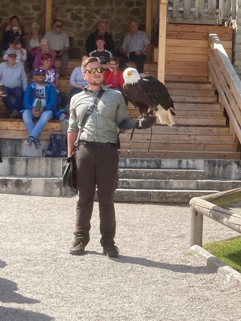 Der Tagesausflug hatte auch heuer wieder seine besonderen Reize. Am frühen Morgen des 25. Mai brach die Reisegruppe mit einem großen Bus am Hohenwarther Bahnhof auf. Bei den Zusteigemöglichkeiten am Feuerwehrhaus, in Grafenwiesen und in Bad Kötzting stießen weitere Mitfahrer zur Gruppe. So wie es bei den GUD-Ausflügen üblich ist, legte man auf der Anfahrt, diesmal auf einem geeigneten Autobahnrastplatz, eine Frühstückspause mit Kaffee und Kuchen sowie herzhaften Wurstspezialitäten und Backwaren ein. Das aufgebaute Kuchenbuffet wurde ausschließlich von den Mitfahrerinnen zur Verfügung gestellt. Schon bald hatte man das erste Ziel der Fahrt erreicht. Im Haus der Bayerischen Geschichte in Regensburg wurde die Gruppe schon erwartet. Beeindruckend war die moderne Art Geschichte darzustellen. Bilder, Exponate, Filme wechseln sich gekonnt und sehr gut aufgemacht ab. Auch die Sonderausstellungen, wie aktuell „Weltenbrand“, Bayern im ersten Weltkrieg tragen sehr zur Attraktivität des neuen Museums bei. Von hier aus ging es weiter zum Mittagessen auf den Adlersberg. Nachdem zwischenzeitlich die Wolken ein paar Tröpfchen zu Boden schickten, nahm man den reservierten Raum im Inneren des Brauereigasthofs dankend an. Das Wetter hatte aber eine Einsicht und beruhigte sich zusehends wieder, so dass der bevorstehende Besuch in der Greifvogelwarte auf der Rosenburg bei Riedenburg im Altmühltal bei bestem Sommerwetter stattfinden konnte. Beeindruckend war hier zum einen die Art der Präsentation, das große und sehr gut vermittelte Wissen über die einzelnen Greifvögel und die präzisen Flugvorführungen der einzelnen Greifvögel. Es waren schon besondere Momente, wenn ein Geier mit drei Meter Flügelspannweite plötzlich über die Köpfe der Zuschauer hinweg glitt, so dass man noch den Luftzug im Nacken spüren konnte. Auch der lautlose Flug der Eule und deren Möglichkeit den Kopf um 240 Grad zu drehen, begeisterte die vielen Zuschauer genauso, wie der Wanderfalke, der mit dem Federspiel auf die Jagd in freier Natur vorbereitet und trainiert wird. Nach der begeisternden Vorführung hatten die Besucher noch Zeit die Unterkünfte der Vögel und die Rosenburg zu besichtigen. Beim Bus bereitete inzwischen Busfahrer Gerhard alles für die Brotzeit am Nachmittag vor. Gut gestärkt wurde dann die Heimfahrt angetreten. Unterwegs gab es auch heuer wieder die übliche kostenlose Tombola für alle Mitfahrer. Die Glückskinder Luisa und Sepp zogen die Treffer aus dem Lostopf. Präzise nach Fahrplan und mit vielen schönen Erlebnissen kam man wieder in Hohenwarth an.