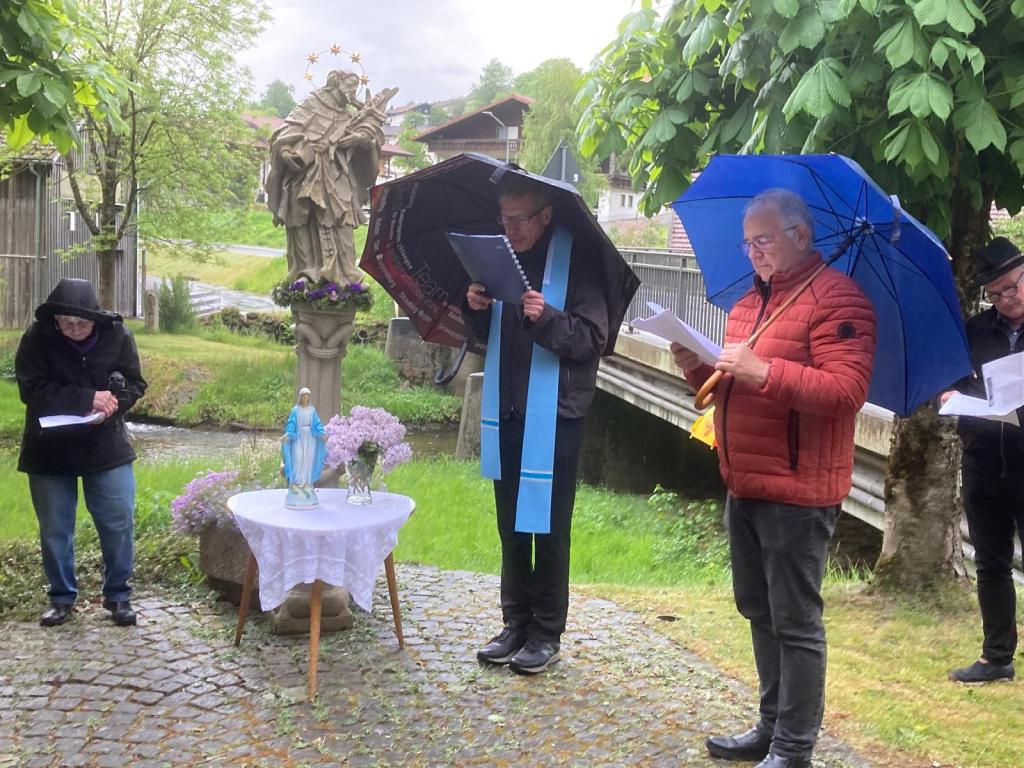 Zur Maiandacht der GUD an der Nepomuk-Statue kamen heuer trotz schlechter Wetterprognosen deutlich mehr Besucher als in den Vorjahren. Selbst pünktlich zu Beginn der Andacht einsetzender Regen konnte die Gläubigen nicht von der Teilnahme abhalten. Gemeinsam mit Pfarrer Johann Wutz betete man zu Maria, der Königin des Friedens. Im offenen Rund um die Nepomukstatue, sie war am Namenstag des Brückenheiligen festlich geschmückt, sangen die vielen Teilnehmer gemeinsam, unter der Leitung von Ewald Pirtzl, bekannte und allen geläufige Lieder zu Ehren der Mutter Gottes. GUD-Vorsitzender Josef Pritzl hatte die Aufgabe des Lektors übernommen und trug die Lesung sowie die Fürbitten vor. Am Ende der Andacht danke er allen, die in so großer Anzahl gekommen waren und den Mitgliedern, die sich zahlreich an den Vorbereitungsarbeiten beteiligt hatten. Anschließend setzte man sich gemütlich zusammen und ließ bei einer Brotzeit und guter Unterhaltung die Feier in den Mai ausklingen.