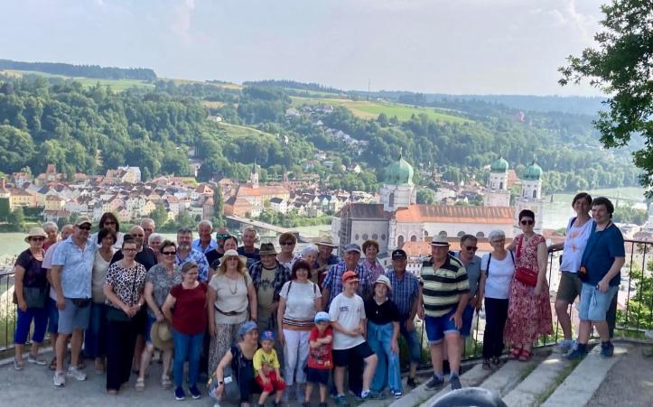 Im Gasthaus „Zum Mühlhiasl“ auf dem Museumsgelände kehrte die muntere Reisegruppe zum Mittagessen ein. Dann wandte man sich der Dreiflüssestadt Passau zu, die nur eine knappe halbe Stunde mit dem Bus entfernt war. Mit einem großen Elektroschiff erkundete die Reisegruppe die Donau, den Inn und auch die Stelle, von der ab Donau, Inn und Ilz nunmehr nur noch als Donau den Weg bis ins Schwarze Meer finden. Der Dom zu Passau stand als nächstes auf der Erkundungsliste. Zwar als Baustelle, aber trotzdem beeindruckend zeigte sich der Bischofssitz mit seiner weltgrößten Kirchenorgel, die aber momentan restauriert wird und abgebaut bei den Instrumentenbauern auf ihren Neuaufbau wartet.